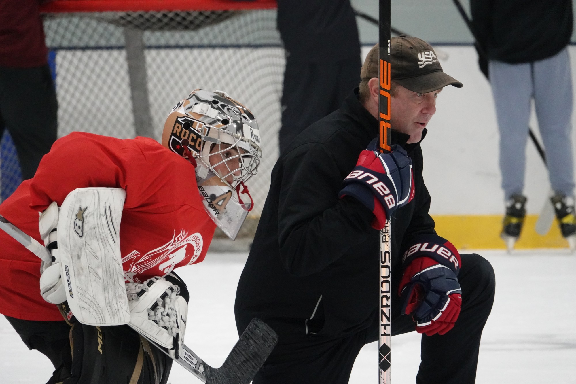 A full set of Ice hockey goaltending equipment is highly recommended for 10U and above ages. 8U can use quick change equipment and a player helmit with a cage.